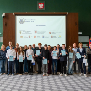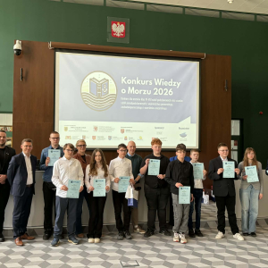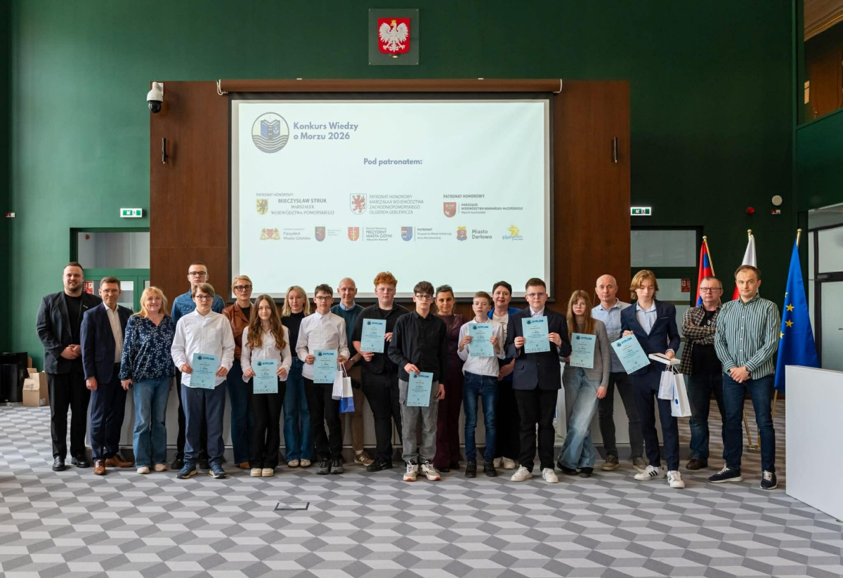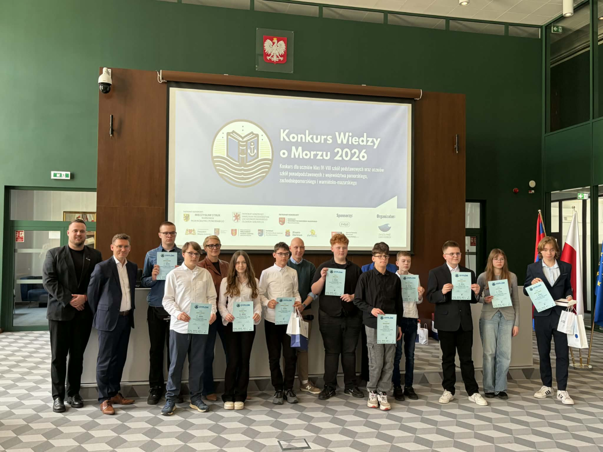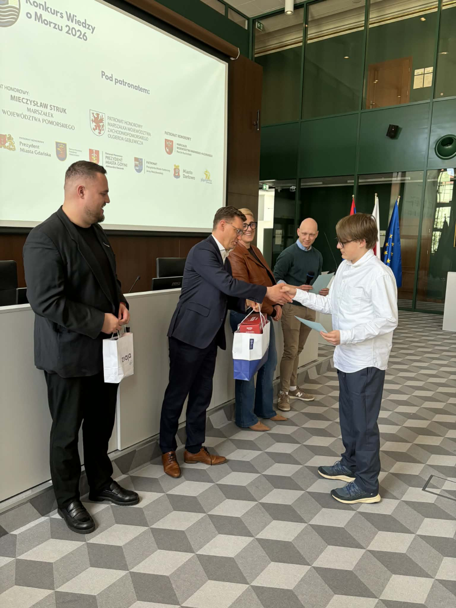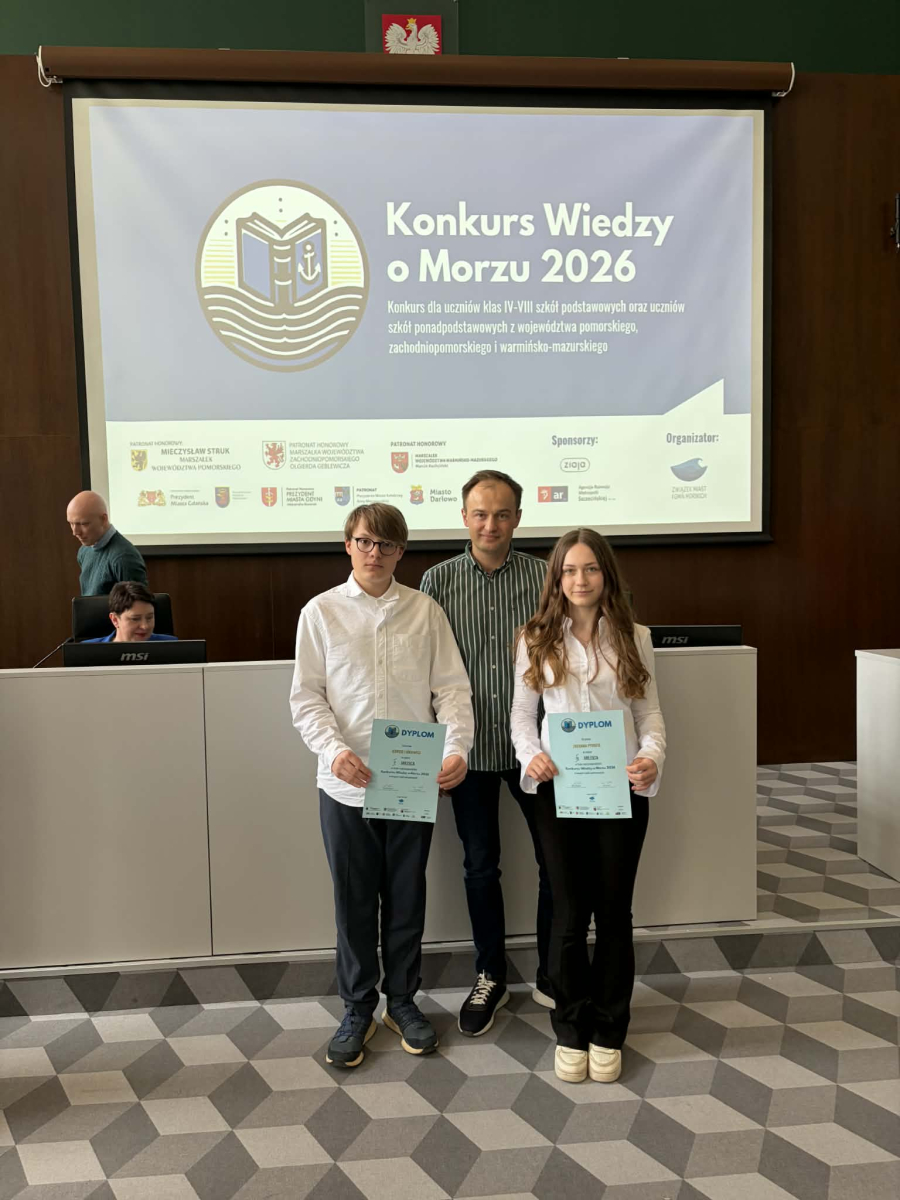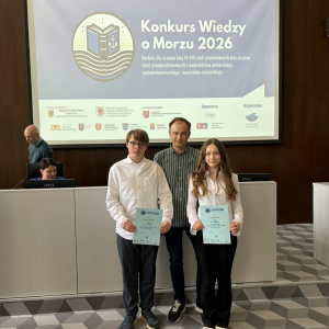 Finał Konkursu Wiedzy o Morzu 2026 za nami! 15.04 w Szczecinie odbył się finał międzywojewódzkiego Konkursu Wiedzy o Morzu Bałtyckim. W etapie szkolnym wzięło udział 794 uczniów z 55 szkół! 160 uczestników zakwalifikowało się do półfinałów. 10 najlepszych osób w dwóch kategoriach: szkoły podstawowe oraz ponadpodstawowe wzięły udział w dzisiejszym finale konkursu. Miło nam poinformować, że uczniowie naszej szkoły znaleźli się w finale i uzyskali tytuł laureata. Jędrzej Liśkiewicz zajął 2 miejsce a Zuzanna Pyrgiel 3 miejsce. Oboje z klasy 8b. Gratulujemy!