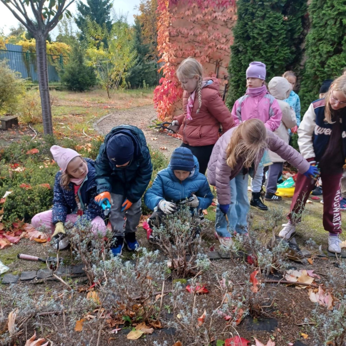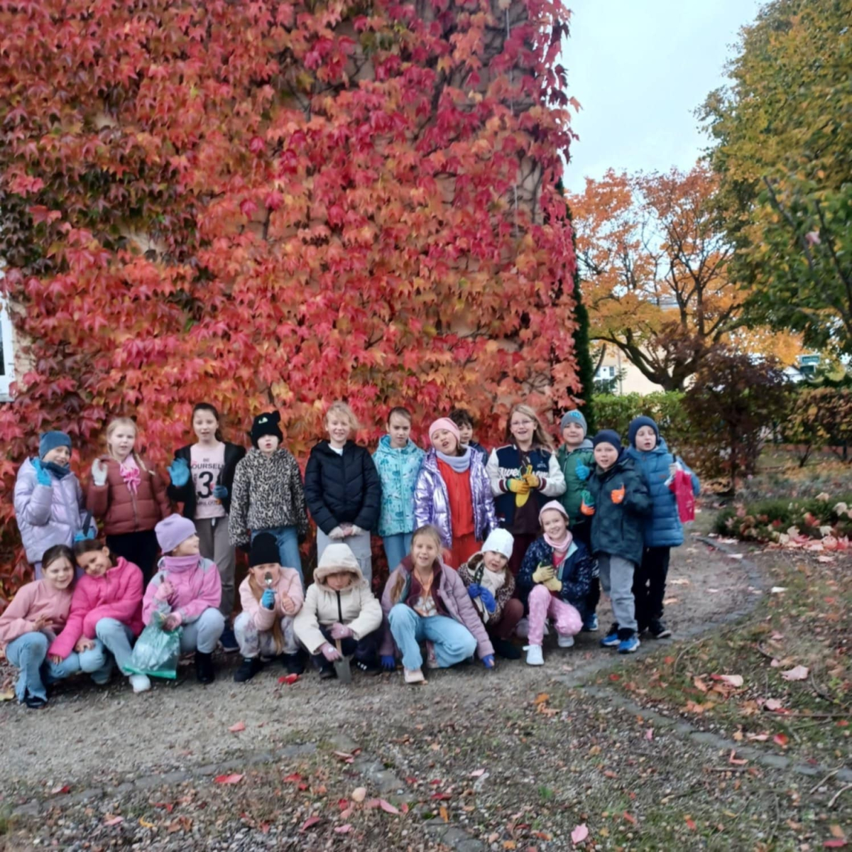 Na zakończenie pełnego wrażeń dnia uczniowie zrobili sobie pamiątkowe zdjęcia w pięknej, jesiennej scenerii – wśród kolorowych liści i kwitnących jeszcze roślin.