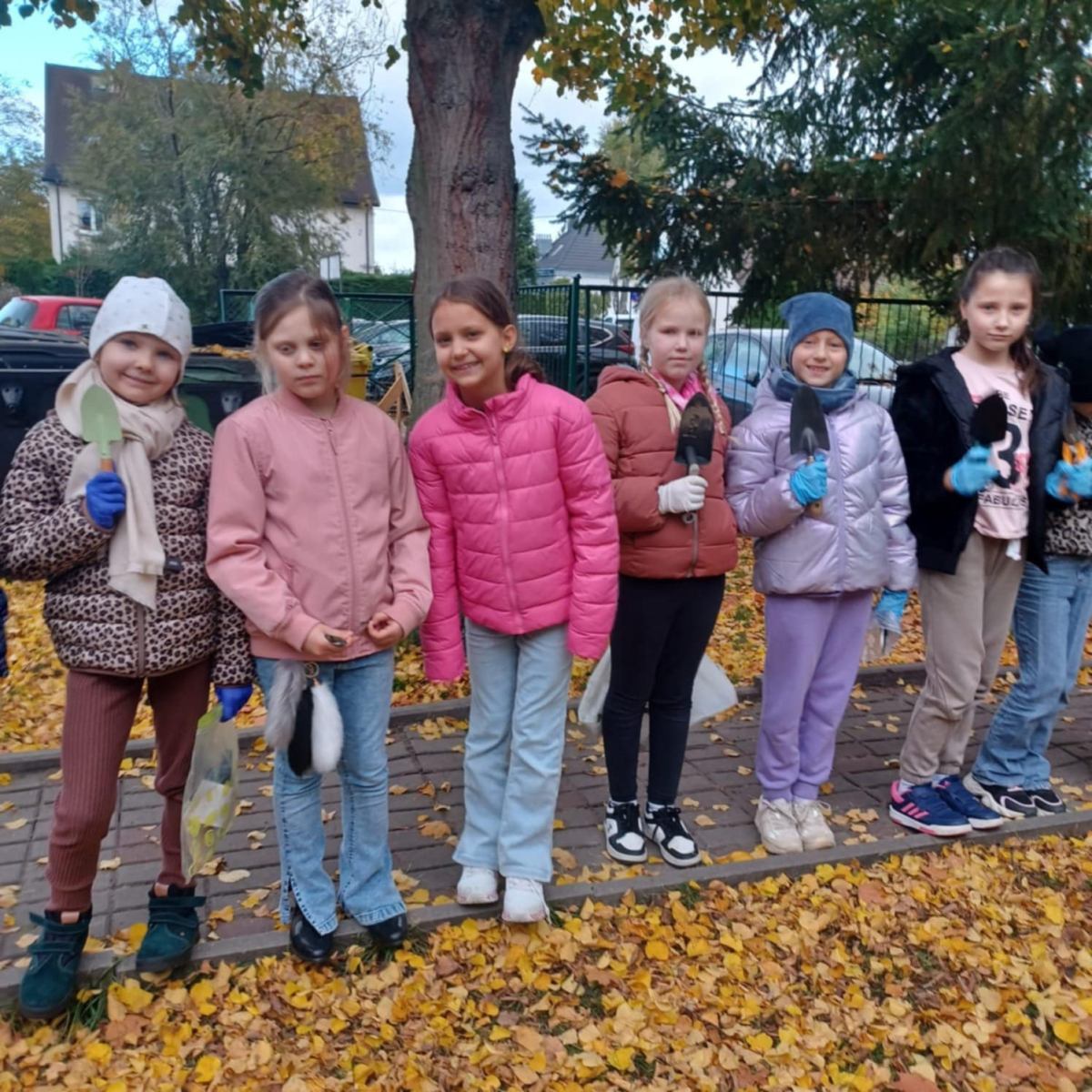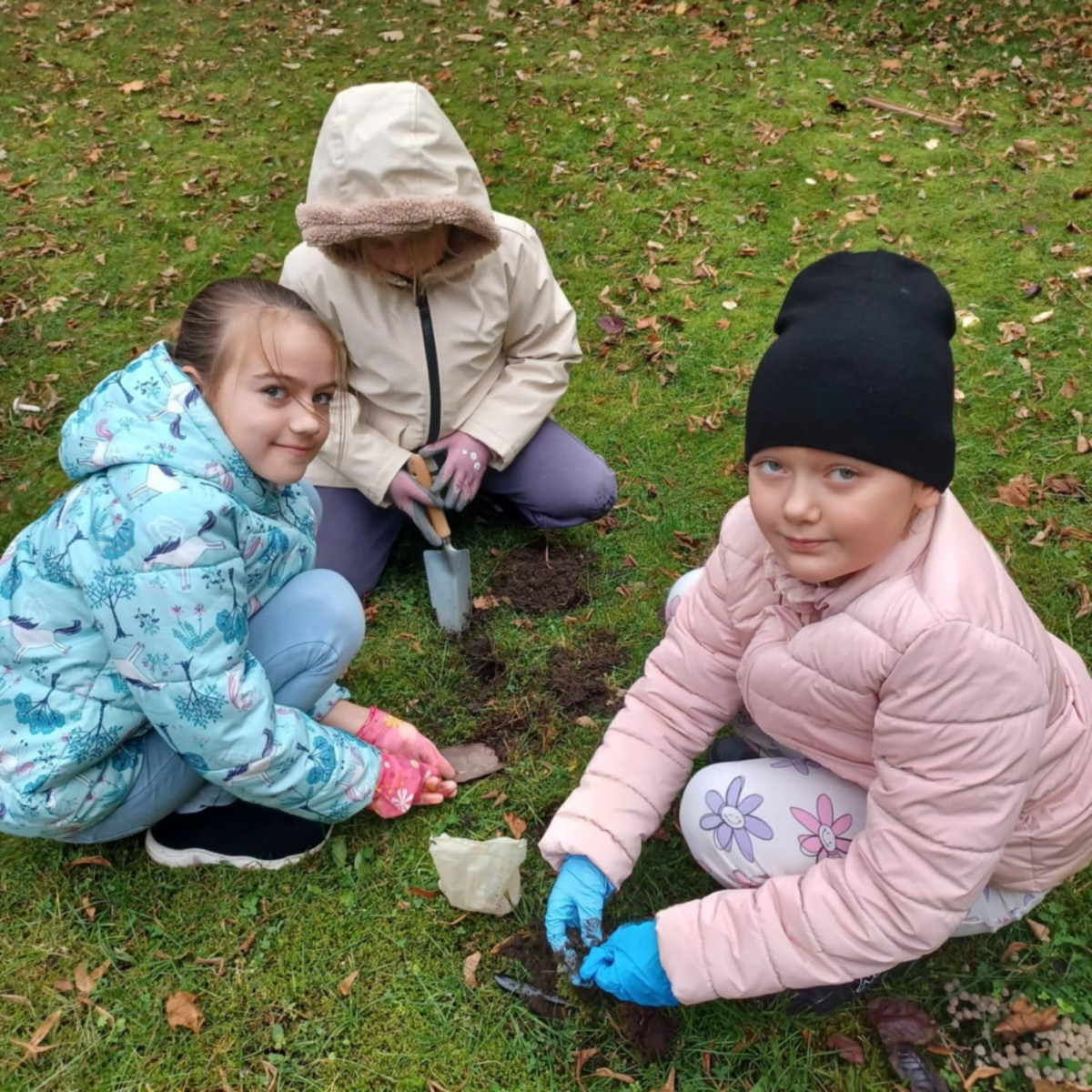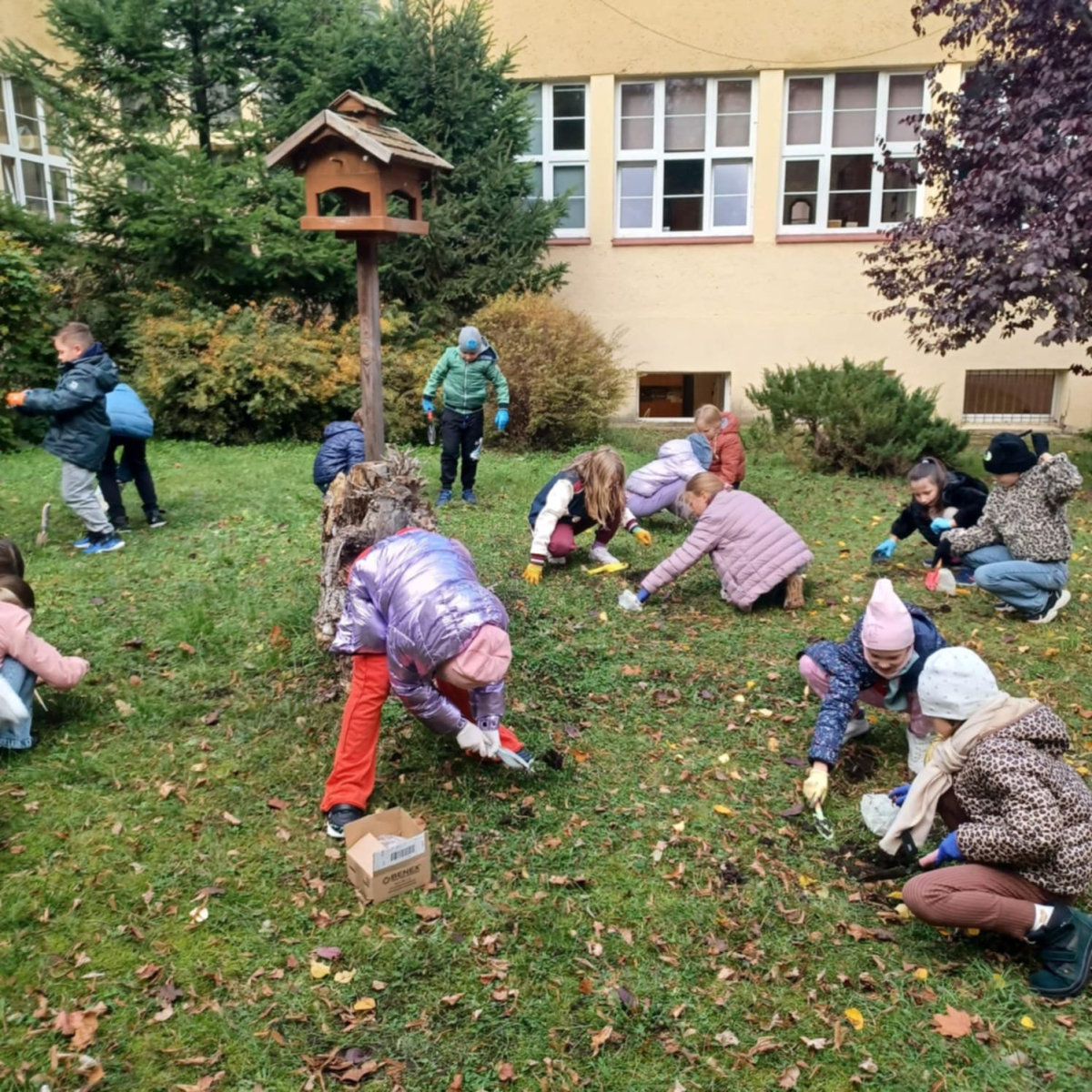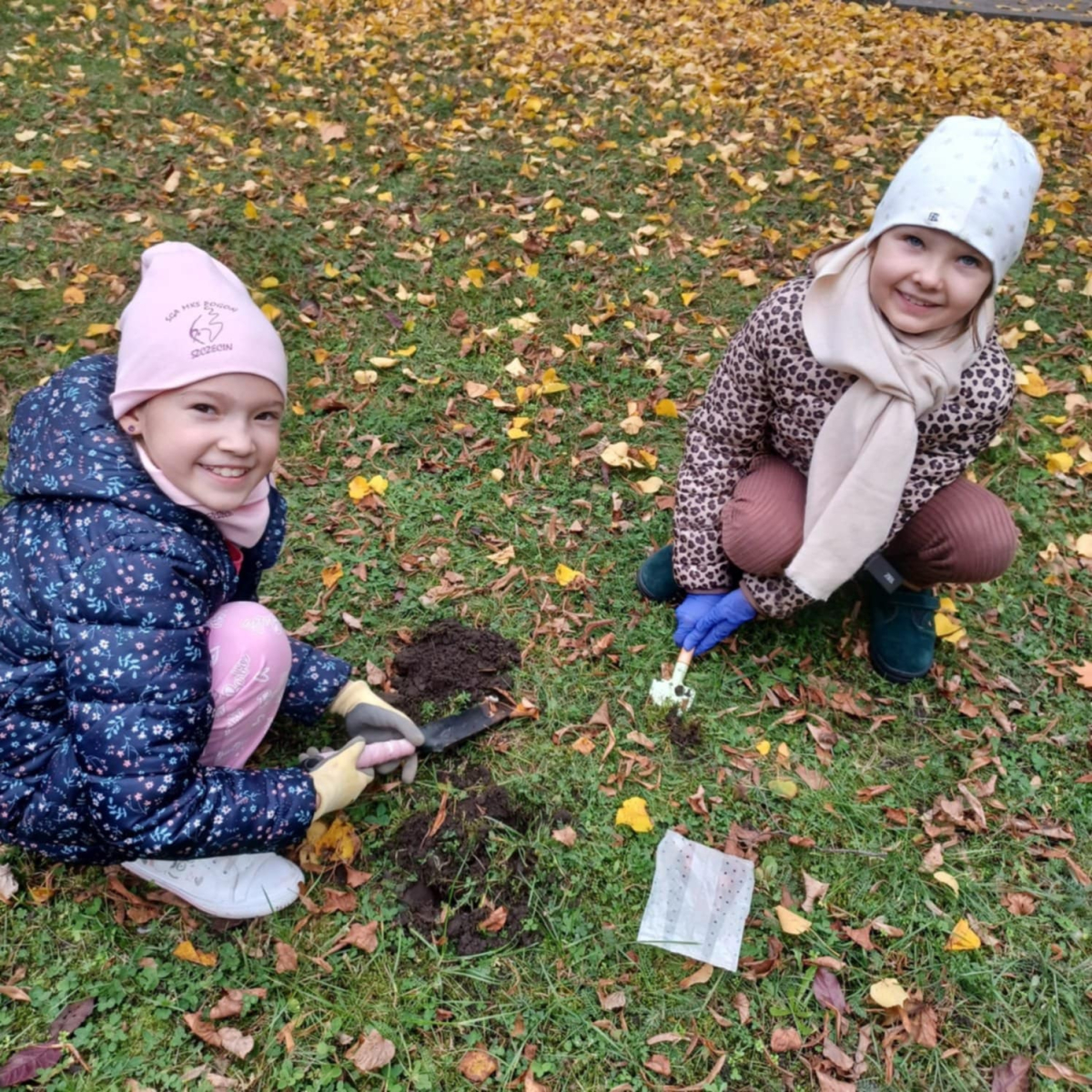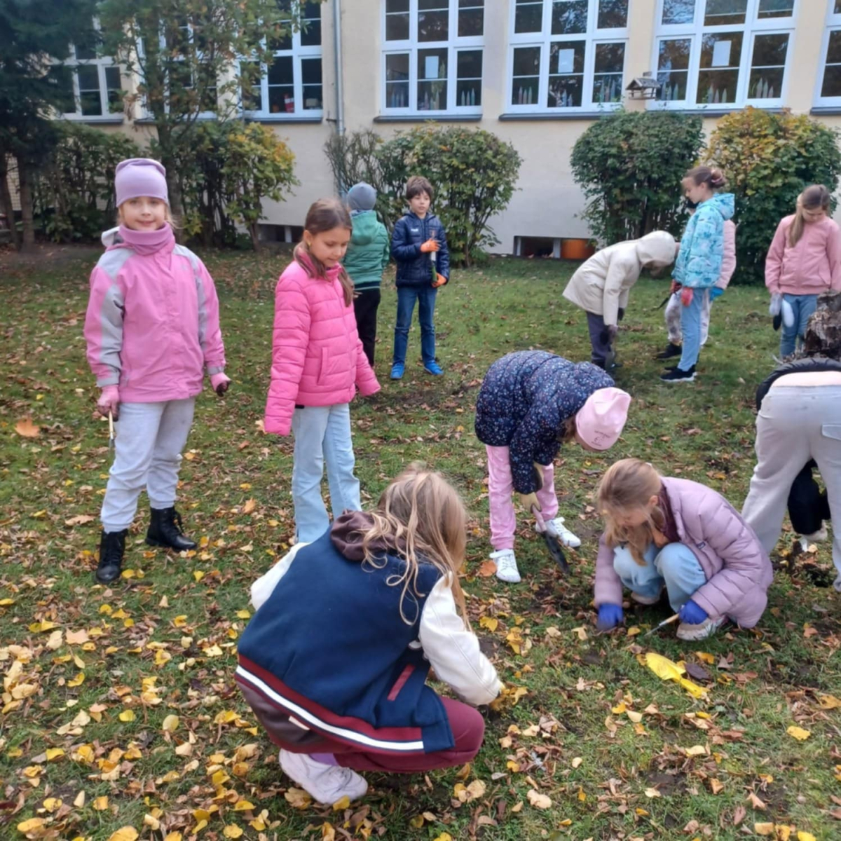 Uczniowie klasy 3a nie boją się zabrudzić rąk, gdy chodzi o dbanie o szkolny ogród! Podczas ostatnich zajęć dzieci z zapałem sadziły cebulki krokusów i tulipanów, które już wiosną ozdobią szkolne rabaty kolorowym dywanem kwiatów.