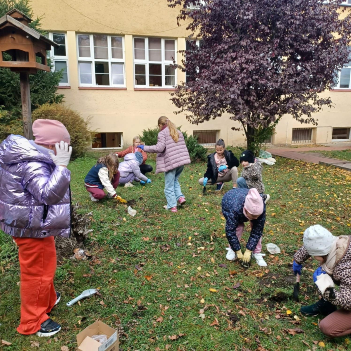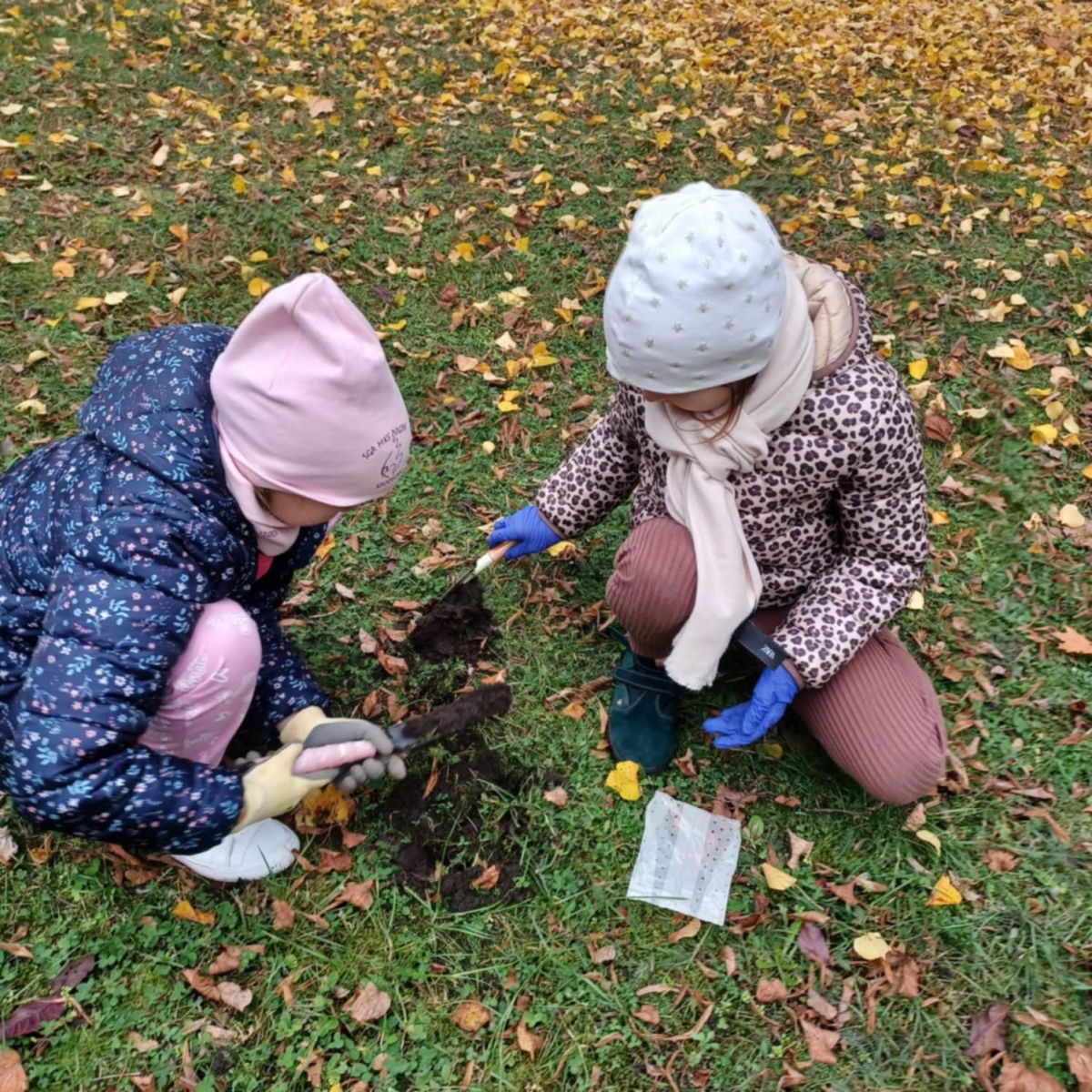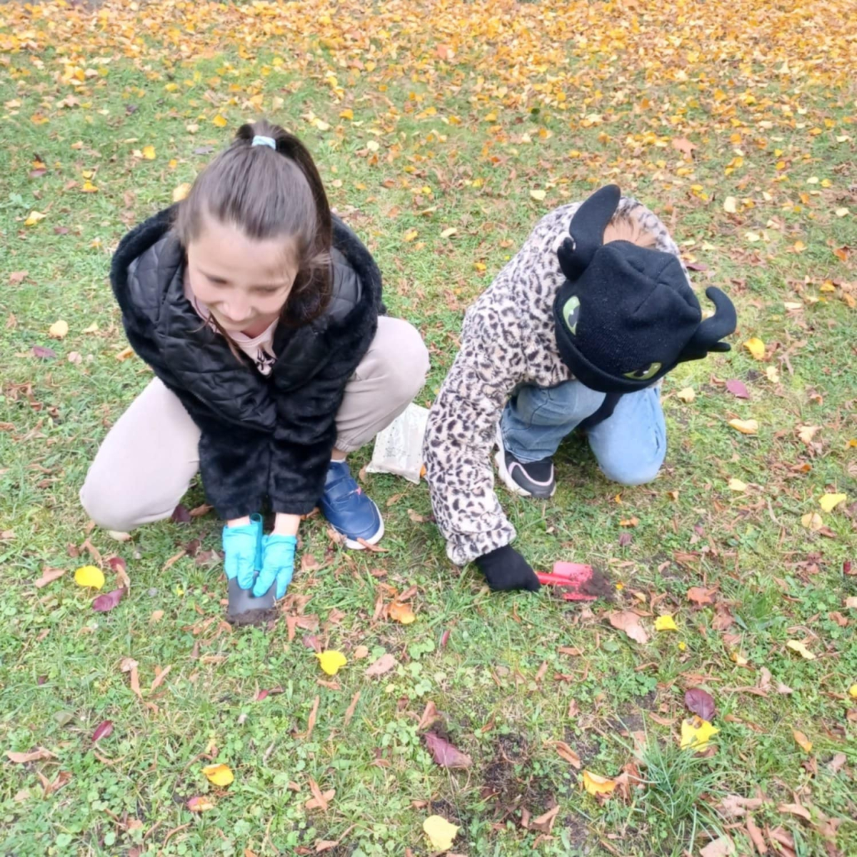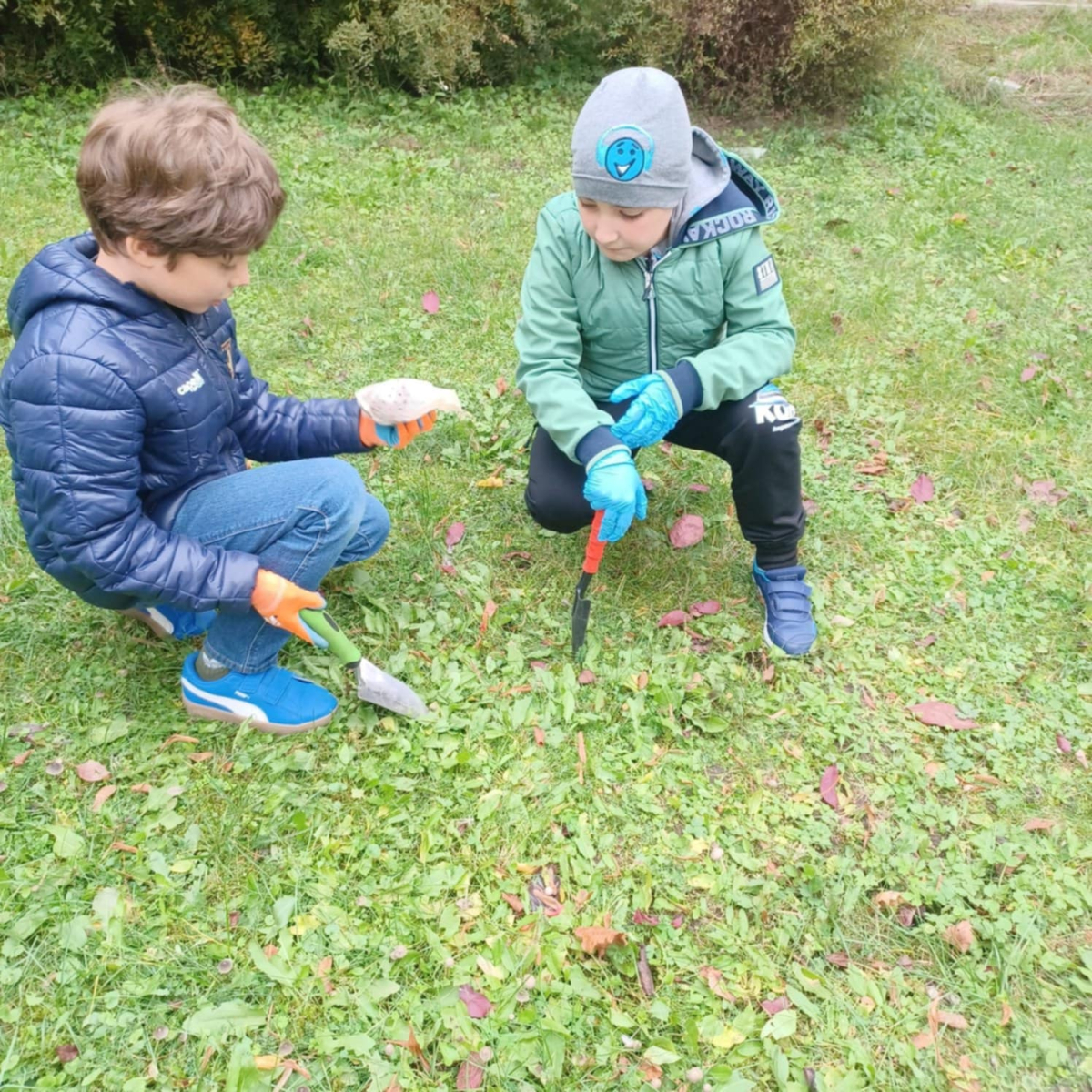 Uczniowie klasy 3a nie boją się zabrudzić rąk, gdy chodzi o dbanie o szkolny ogród! Podczas ostatnich zajęć dzieci z zapałem sadziły cebulki krokusów i tulipanów, które już wiosną ozdobią szkolne rabaty kolorowym dywanem kwiatów.