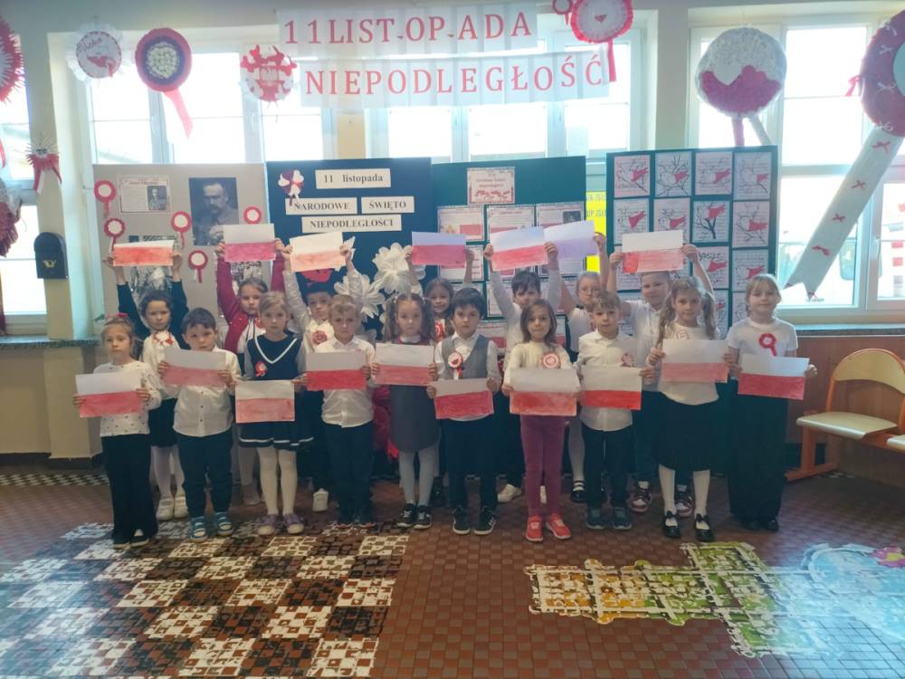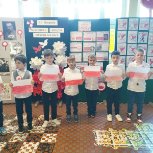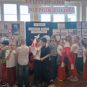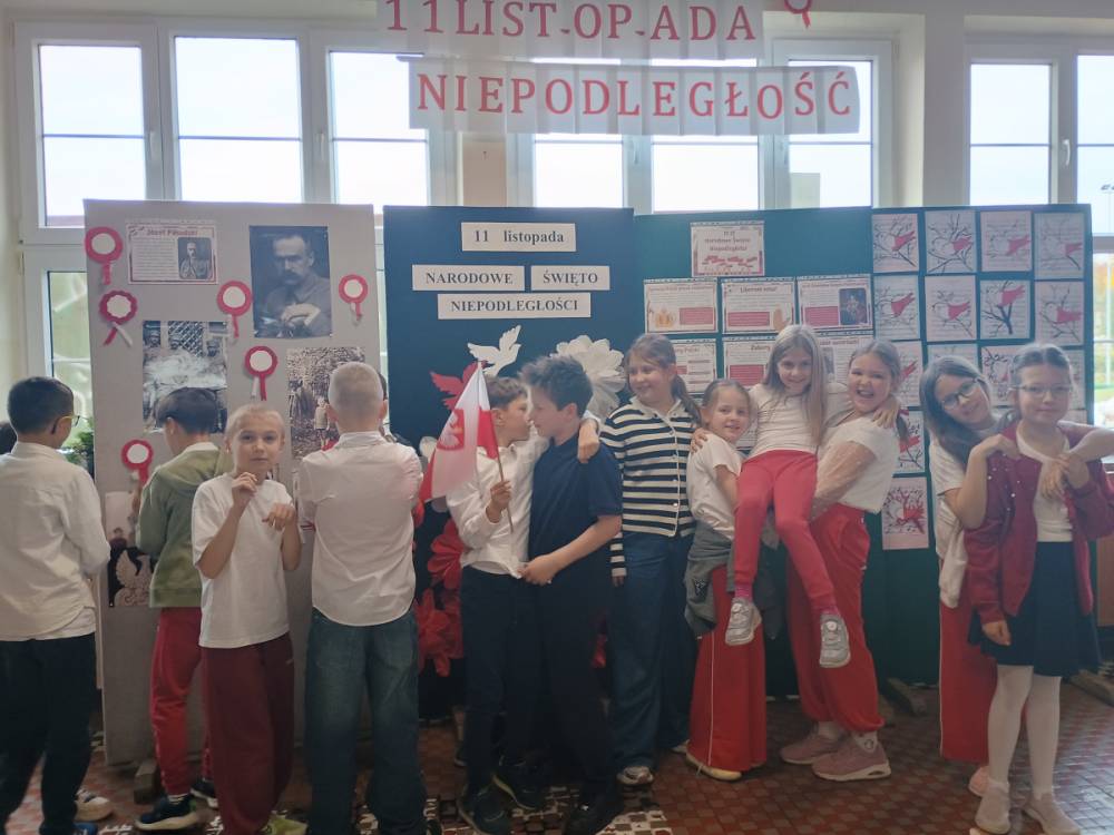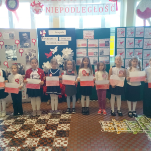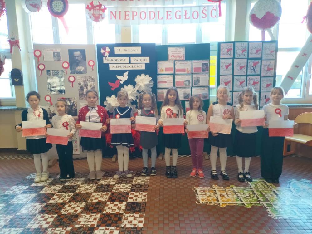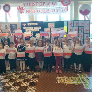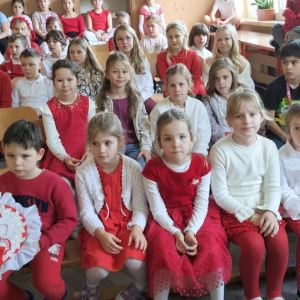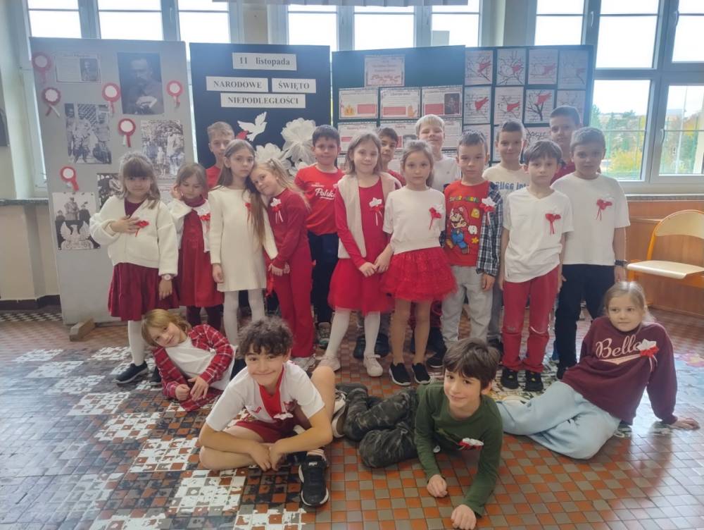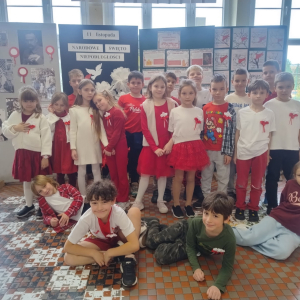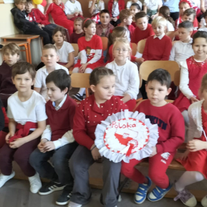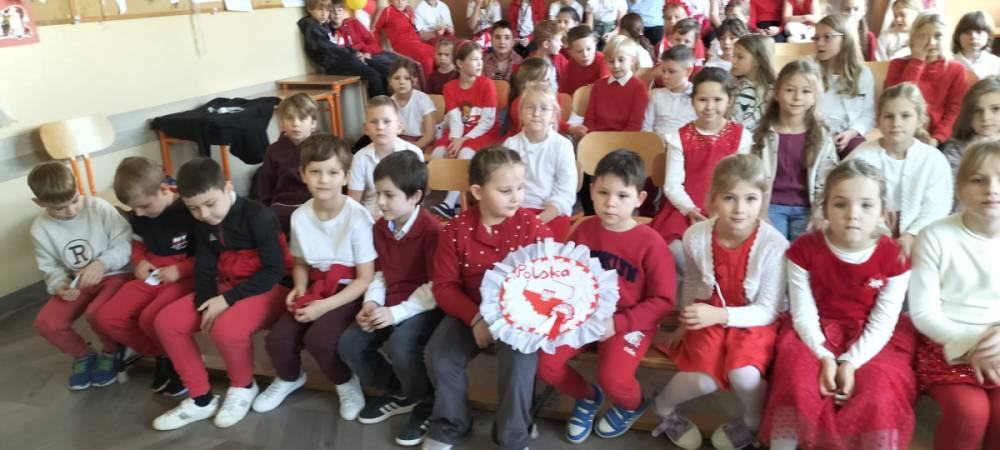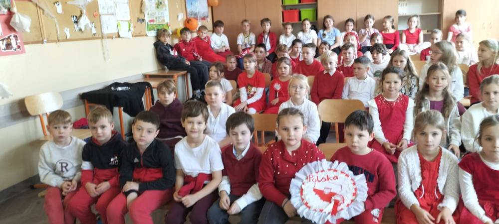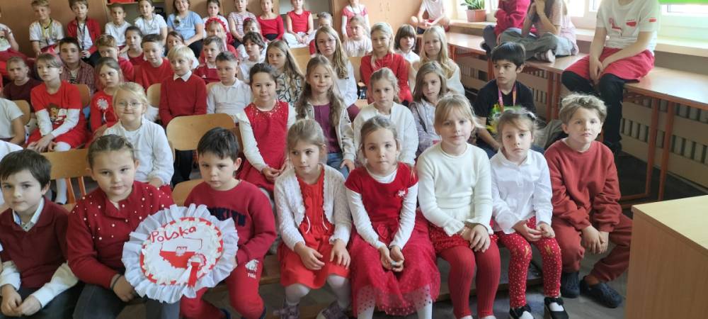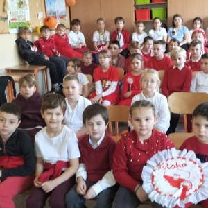 Uczniowie naszej szkoły ubrani na biało- czerwono uczestniczyli w spotkaniu dotyczącym 11 listopada. Dziewczynki z klasy 3d, Agatka, Amelia oraz Zosia, profesjonalnie je poprowadziły. Klasa 2a zachwyciła śpiewem pieśni patriotycznych.