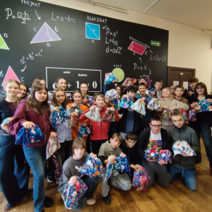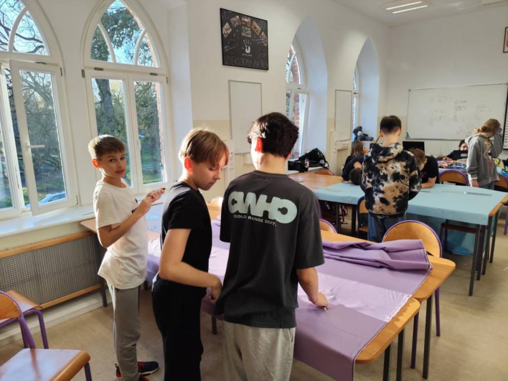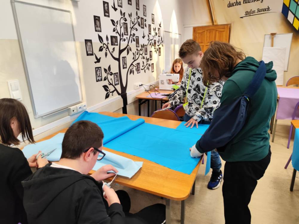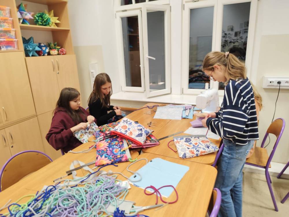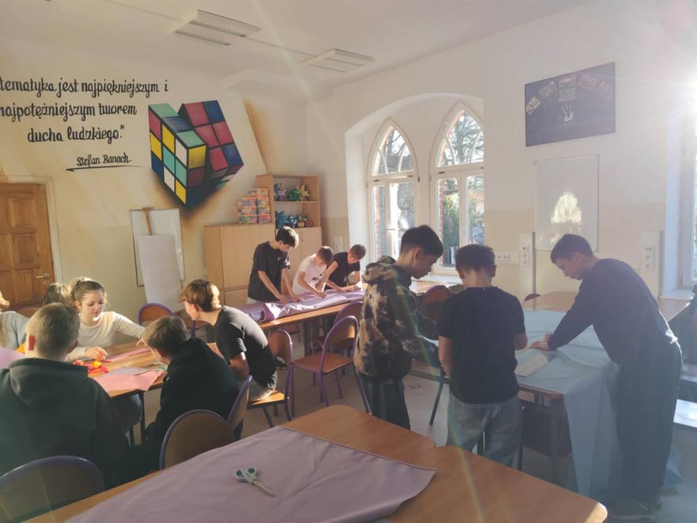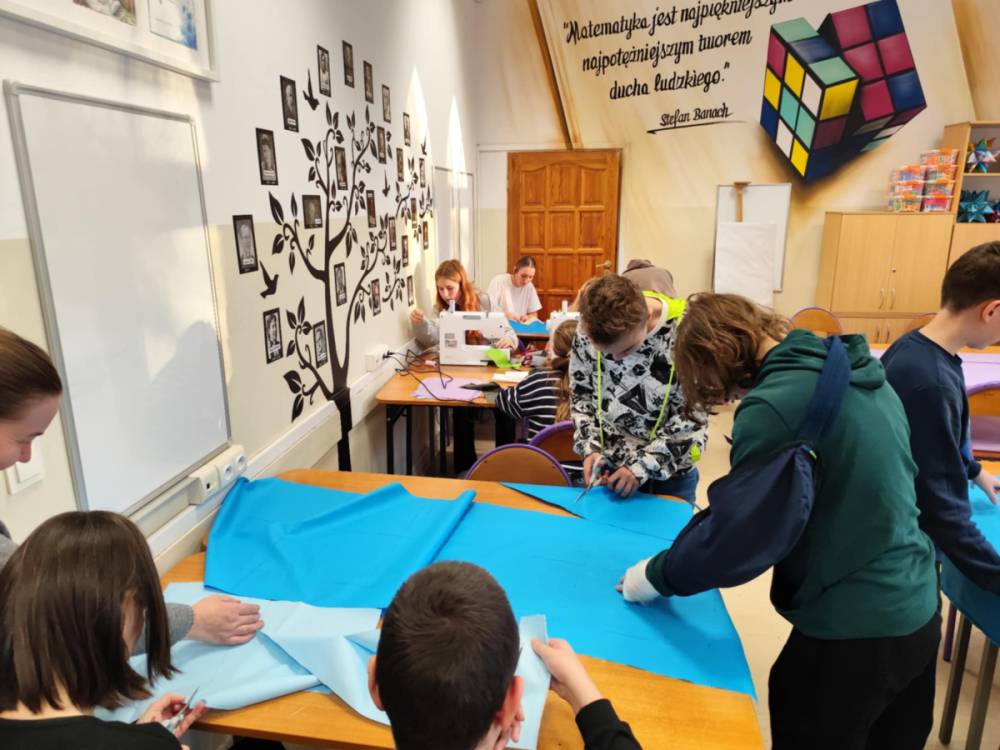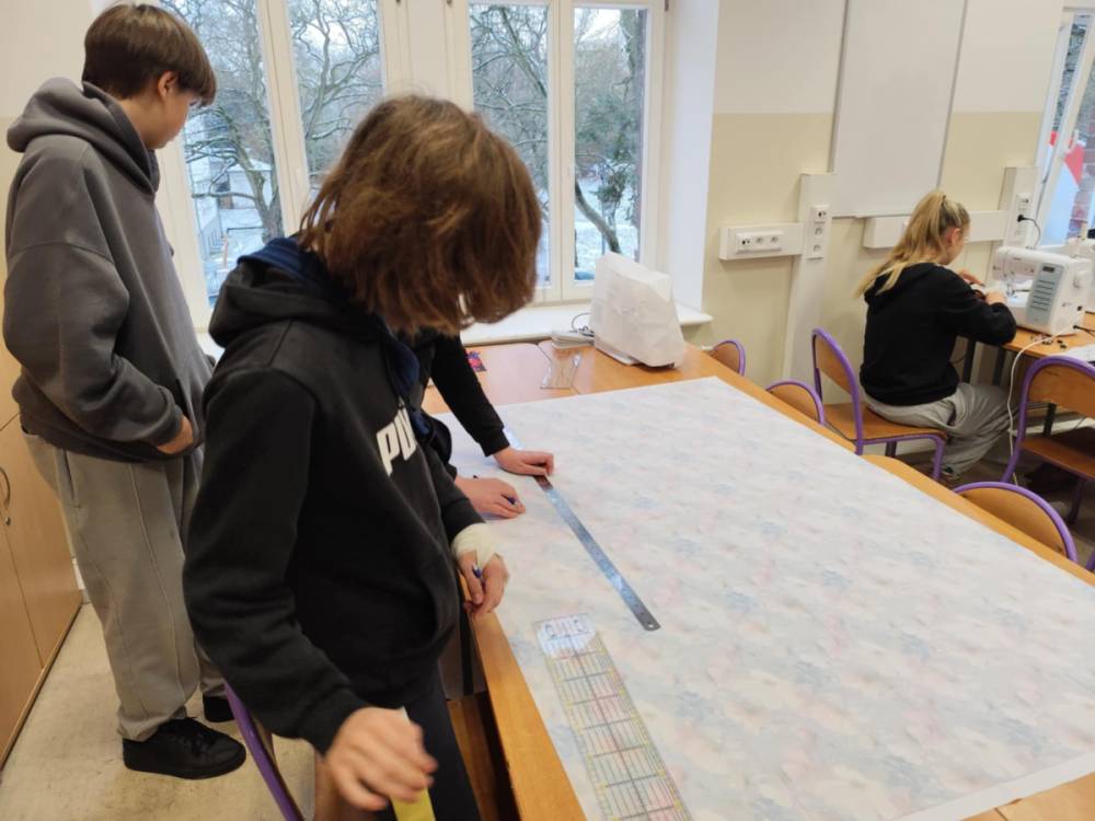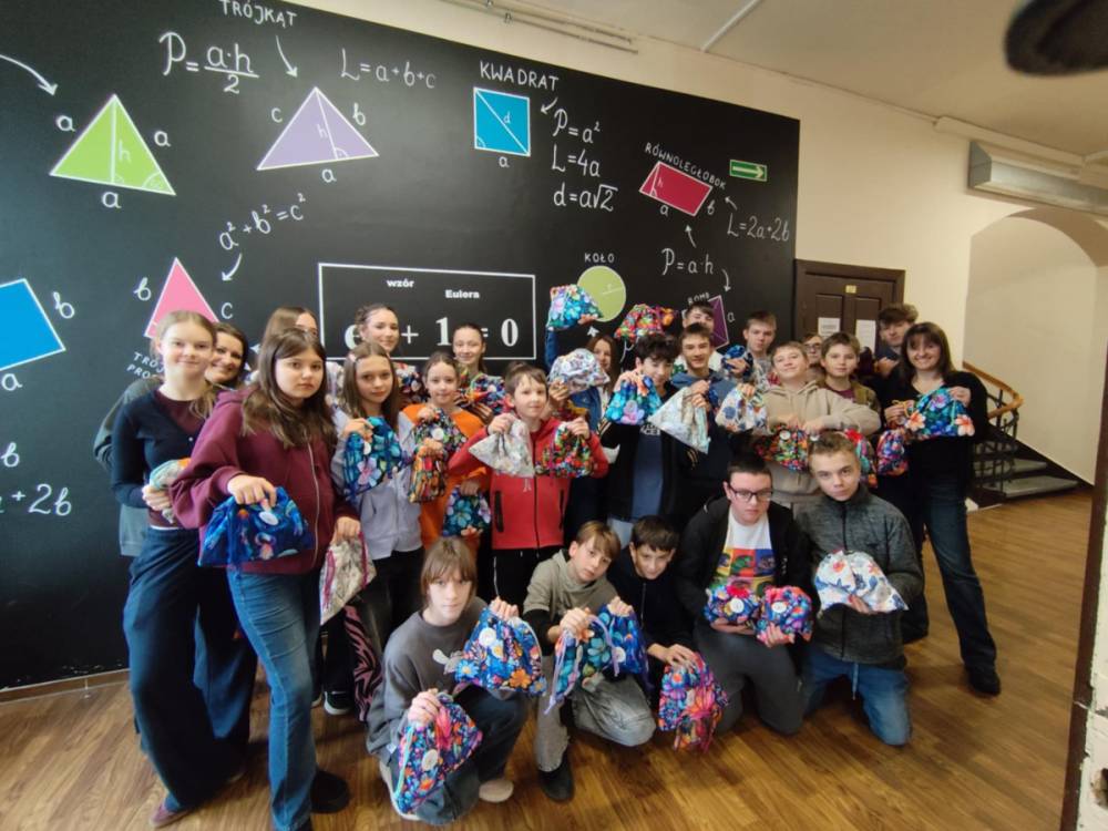Każda sakiewka powstała dzięki wspólnej pracy uczniów, którzy z ogromnym zaangażowaniem mierzyli, a następnie kroili materiały, szyli na maszynach, wiązali troczki i dbali o każdy detal. W woreczkach znajdą się drobne, przydatne upominki, które mają przynieść odrobinę ciepła i otuchy osobom w trudnej sytuacji zdrowotnej. Każda sakiewka została również ozdobiona tematyczną przypinką. Dodatkowo uczniowie klasy 8A przygotowywali w tym czasie kartki świąteczne, które dołączymy do woreczków.