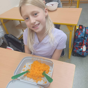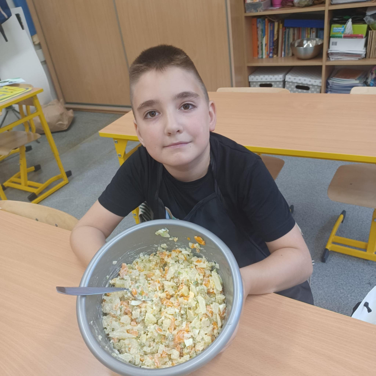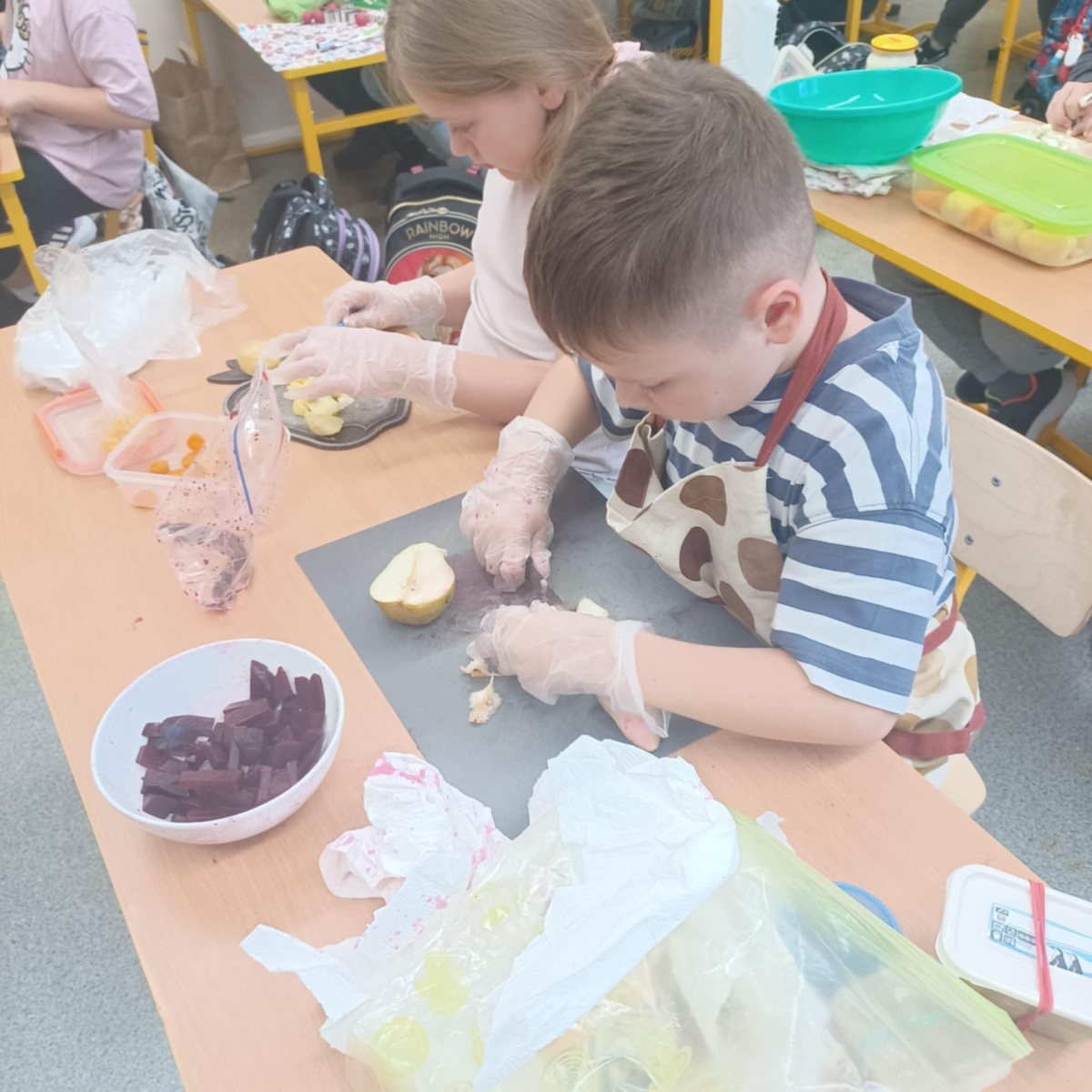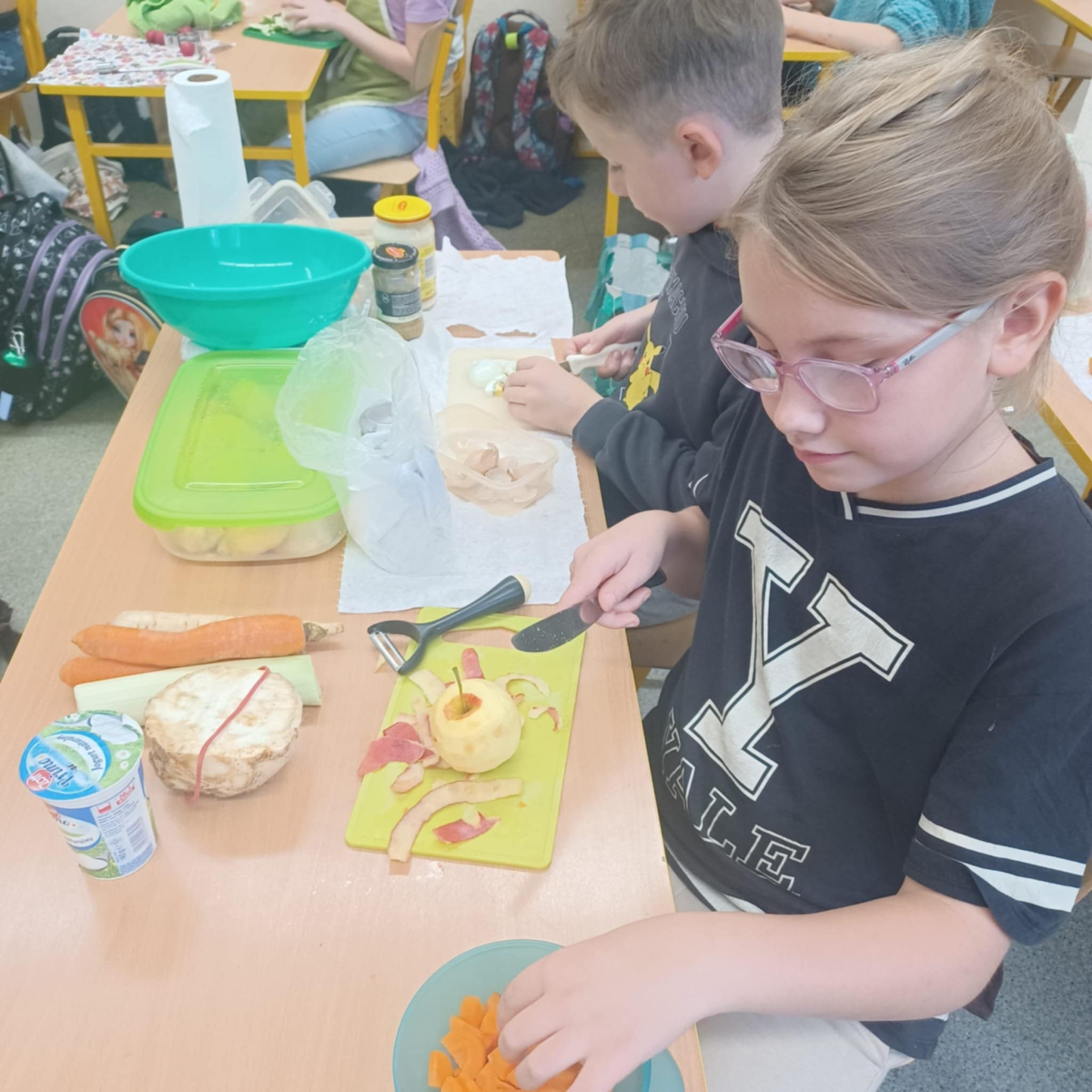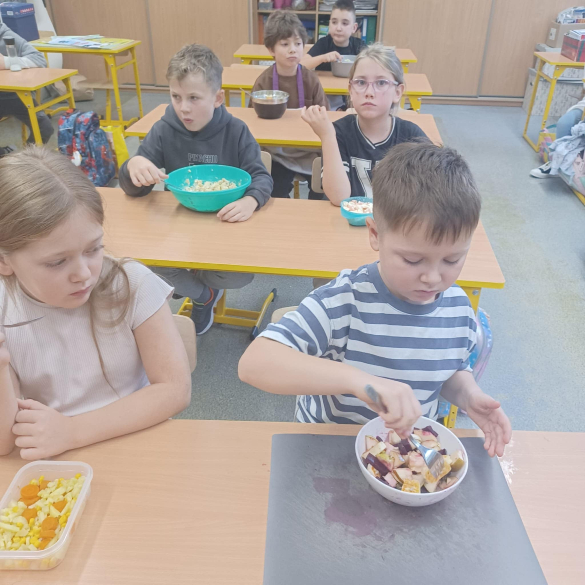 To jednak nie koniec smakowitych atrakcji! Podczas zajęć kulinarnych uczniowie przygotowali zdrowe sałatki i surówki warzywne, ucząc się, jak w prosty sposób można tworzyć kolorowe, pełne witamin potrawy.