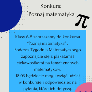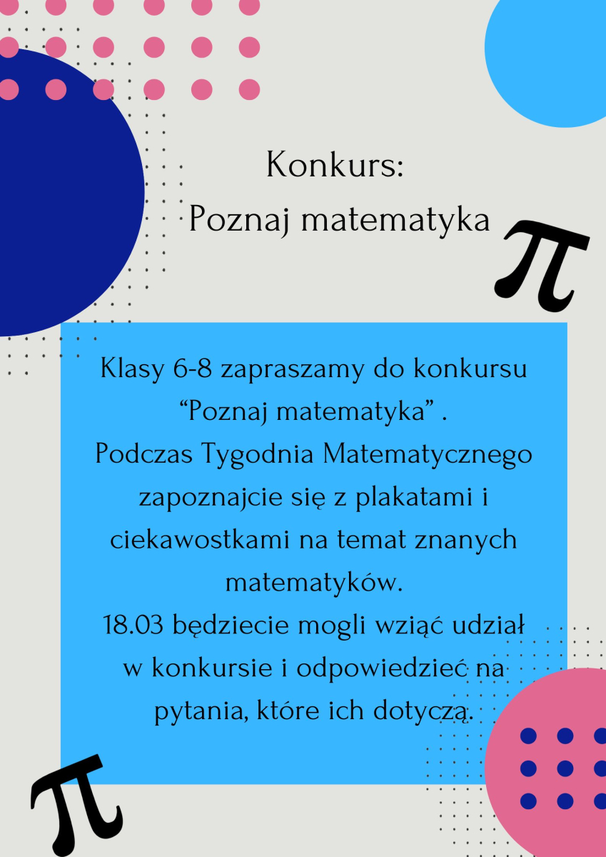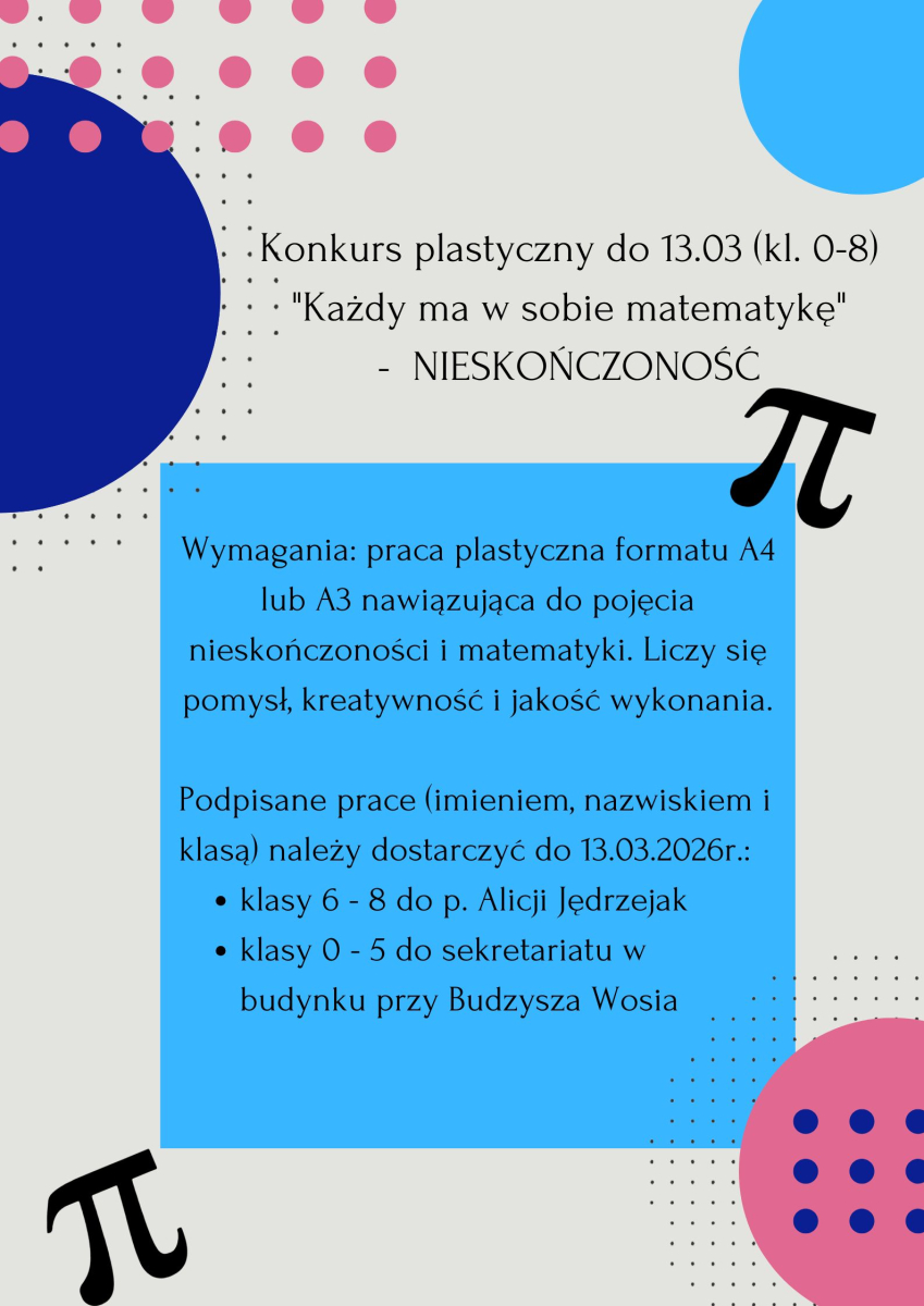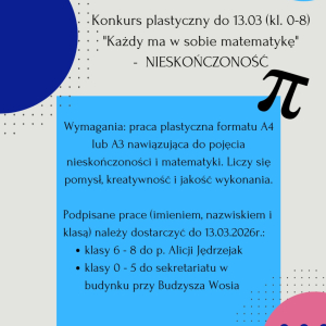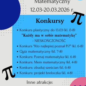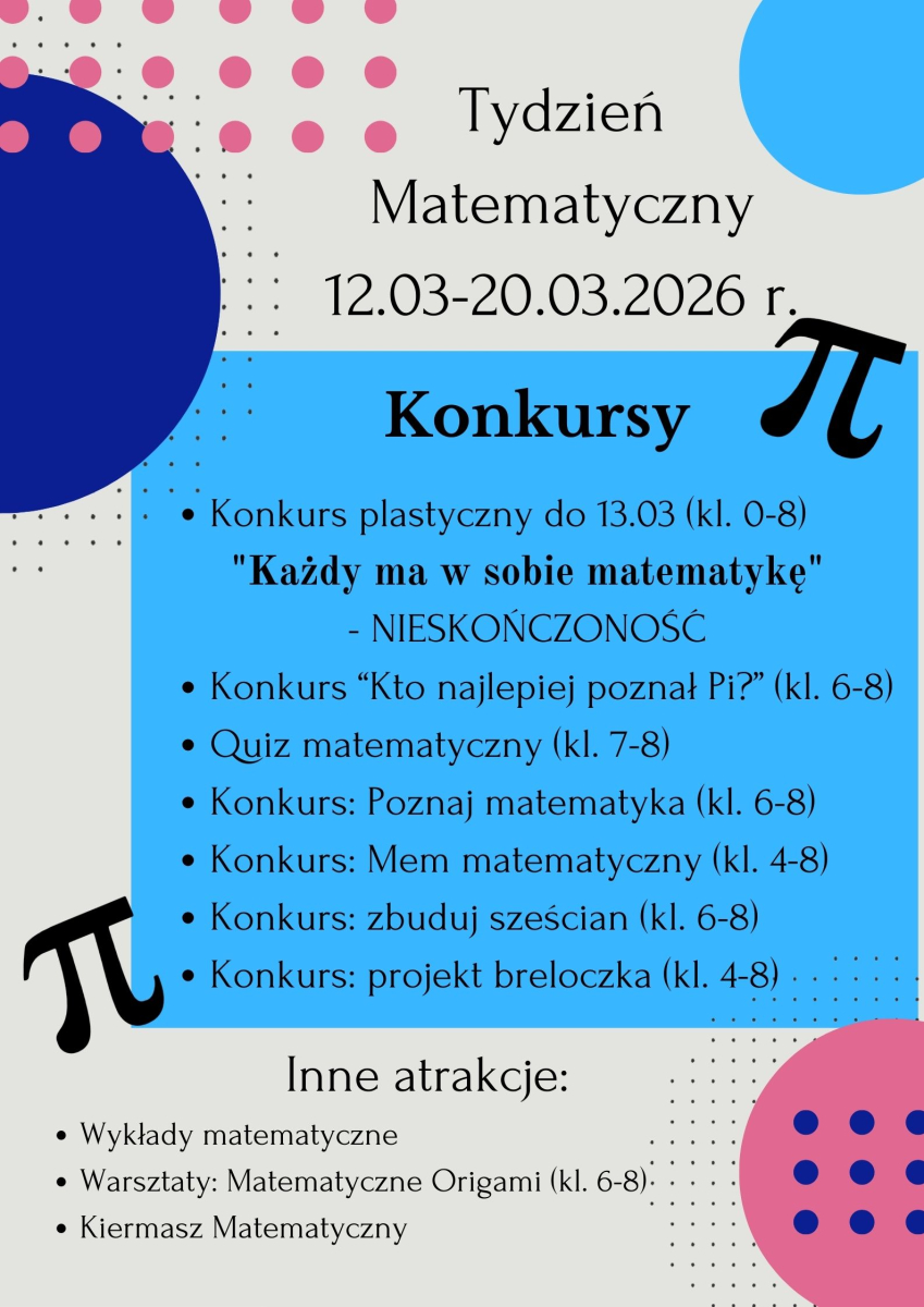 W dniach 12.03–20.03.2026 r. w naszej szkole odbędzie się wyjątkowe wydarzenie – Tydzień Matematyczny. Przed nami mnóstwo konkursów, wyzwań i atrakcji, które pokażą, że matematyka może być ciekawa, kreatywna i pełna nieskończonych możliwości!